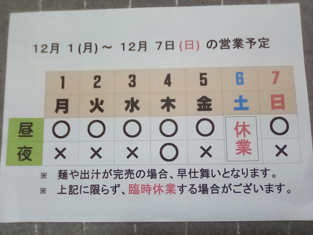 12月1日(月)〜12月7日(日)の営業予定