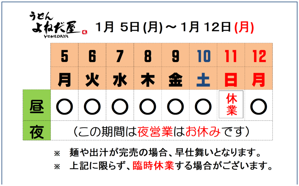 1月 11日 [[red;(日)]]は、[[red;臨時休業]] です。