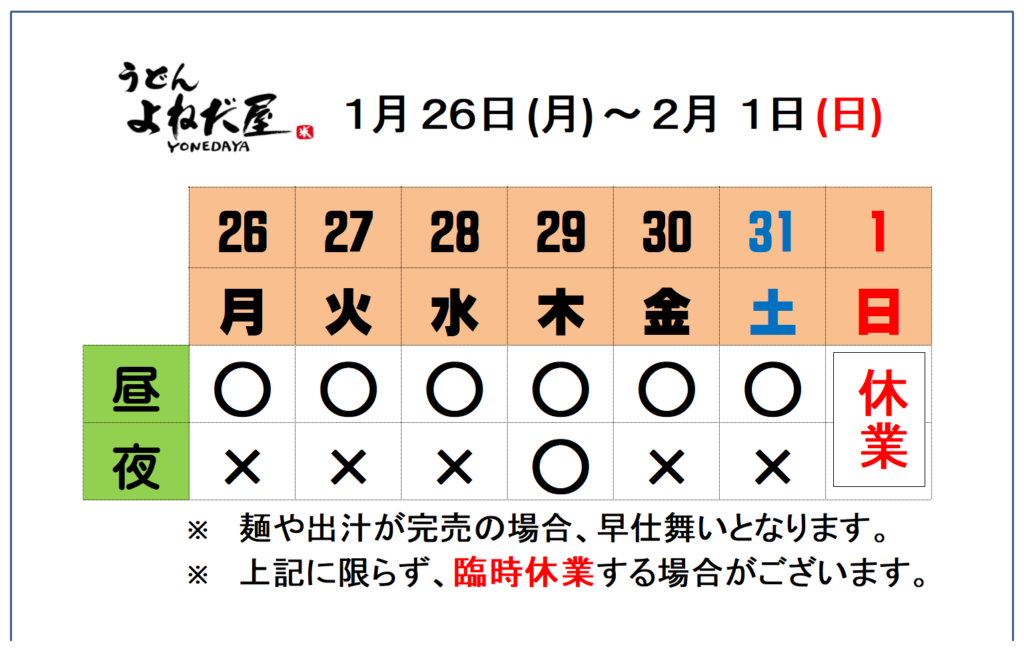 1月26日(月)〜2月 1日(日)の営業予定