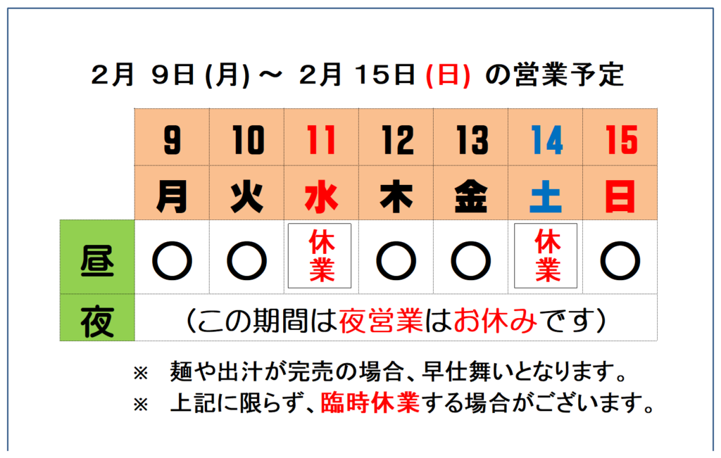 2月11日(水)、2月14日(土)は、【休業】 とさせていただきます。